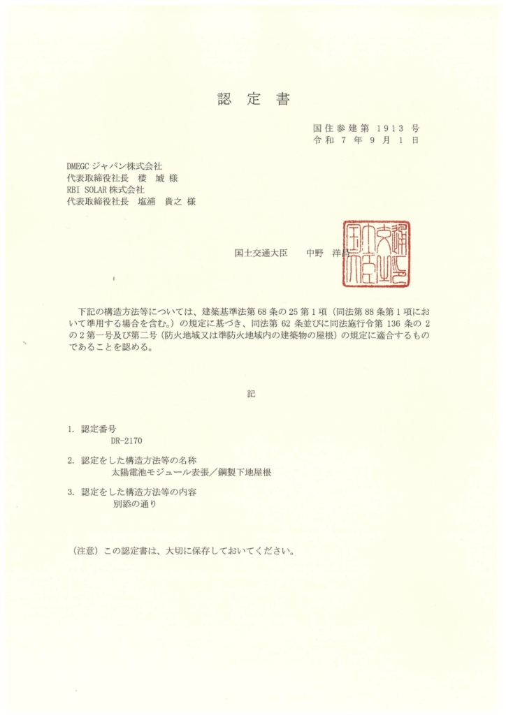 この度、当社のソーラーカーポートはTier1モジュールメーカーであるDMEGC社と協業し、2025年9月1日(月)に飛び火認定(以下「DR認定」という。)を取得いたしました。